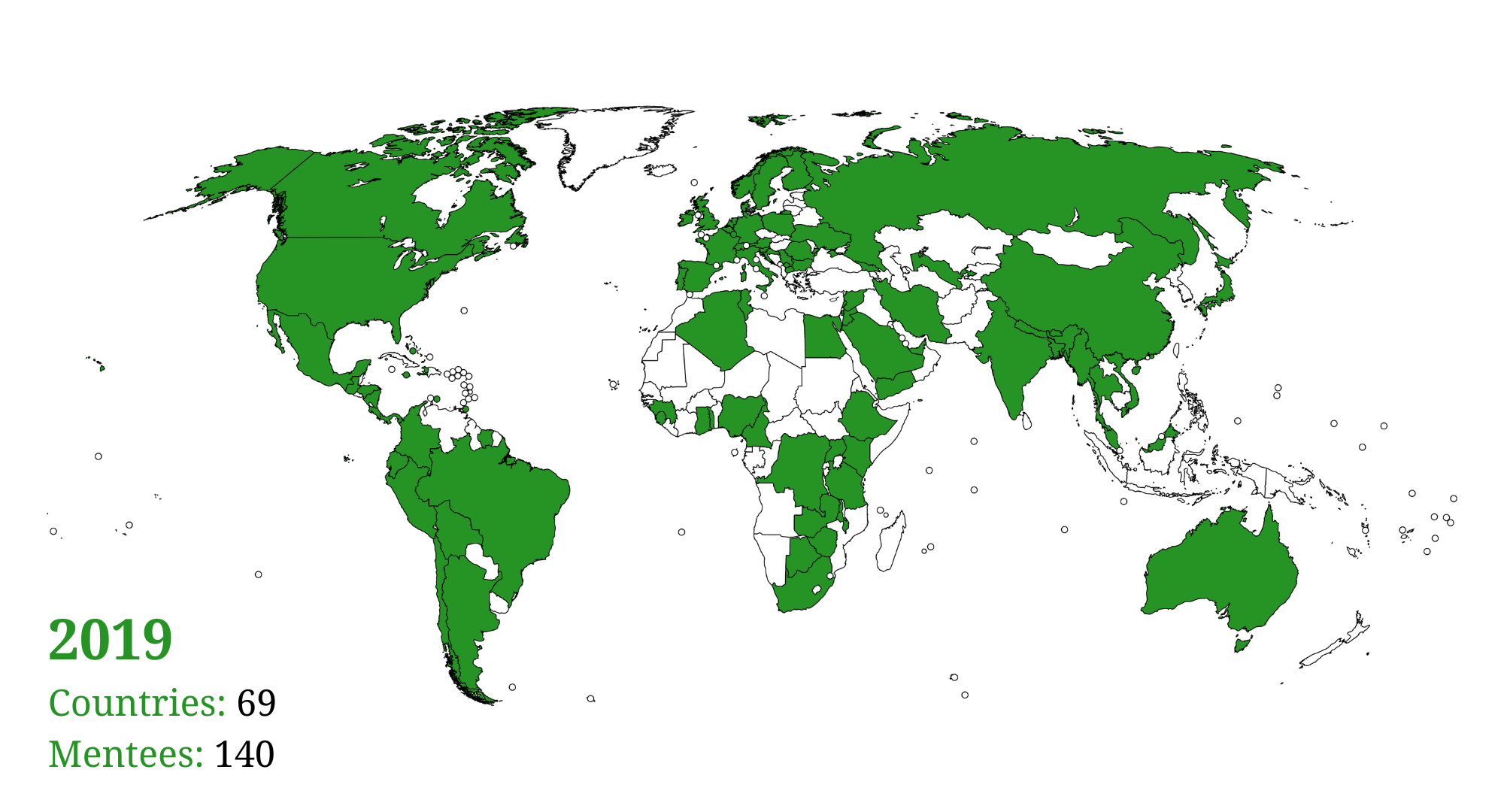 In 2019, our 88 Mentors and Mentees were born in or are currently working or studying in 70 different countries, in five continents, seven regions and 16 sub-regions of the world: